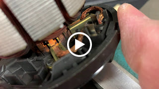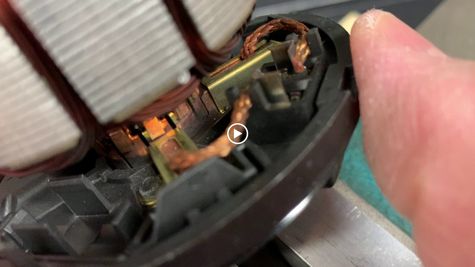 交換パーツはカーボンブラシとアマチュアベアリングの2点。 ベアリング外しは隙間が無く、ベアリングプーラーの爪が入らないので、グラインダーで削り分解して抜きました。 |